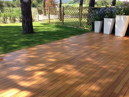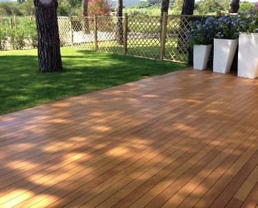 Il decking è un tipo di pavimentazione per esterni che può essere utilizzato per balconi, bordi piscina, camminamenti e vialetti esposti ai cambiamenti climatici e alle intemperie. Viene posato su travetti (sollevati da terra) con fessure di circa 5 mm tra una tavola e l'altra per consentire il drenaggio dell'acqua. Con l'aiuto di piedini e strutture sottostanti, i livelli possono essere coperti per creare un unico grande livello, o creare una scala dove non esiste.